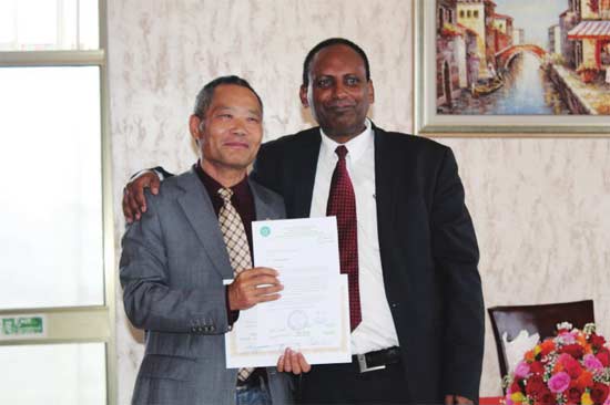埃塞俄比亚农业部长(右)向李荣刚颁发埃塞俄比亚部长顾问聘书。