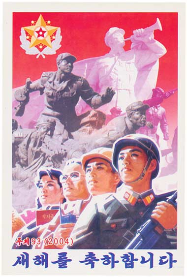 “发展”的主题在朝鲜设计界出镜率很高,比如一张明信片上印着正在建设的水坝,前面则是两名载歌载舞的士兵,下面印有“让人民和军队像钢铁一样团结在一起”的口号。