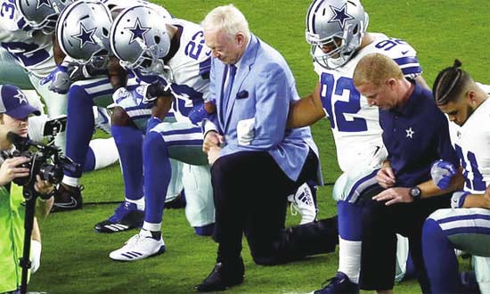 当地时间9月25日的一场比赛前,NFL达拉斯牛仔队球员,以及球队老板琼斯在唱国歌前单膝跪地。