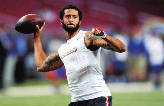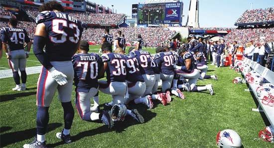 这场延烧近一个月的风波,源头可以追溯到国家橄榄球联盟(NFL)去年的一场比赛。在赛前奏国歌的环节,黑人球员科林·凯普尼克并没有起立,而是单膝下跪且拒唱国歌,与其他球员将右手放在胸前的姿态形成鲜明对比。摄像机记录下了这幕不寻常的景象。
