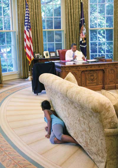 2009年8月5日,美国总统奥巴马8岁的女儿萨莎藏在白宫椭圆形办公室的沙发后,偷看奥巴马读简报。