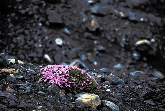走出迷宫般的熔岩城堡,面前仿佛一座巨大的煤堆,黢黑的山石中一条细细的登山路迂回而上,这就是米湖地热区核心的惠尔火山口了。我登上过三山五岳,还不曾有缘爬过火山。惠尔火山口虽然不高,但爬上去也要费一番气力,登山道用碎石铺就,稍不留神便会滑到。一路抓着路侧的保护绳迎着大风登顶,来到了火山口的边沿之处。除了黑色的碎石,火山口中荒芜一物,此处一览众山,可俯视米湖地热区的全景。值得一提的是,在如此荒凉的火山上,找不到哪怕一棵树、一根草,沿途只有顽强的苔藓在朔风中生存,正逢夏日,开放着让人动容而又心生怜悯的粉色小花。
