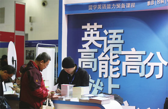 3月25日,北京第22届中国国际教育巡回展上某英语培训机构的展台。