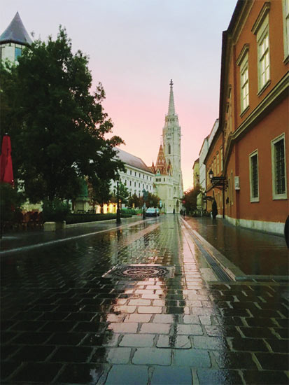 天空飘着小雨,乌云还未覆盖远方的天空,那里出现了一抹红色。几乎顾不上继续体会老城的静谧,我一路快走到山上。雨水打湿了石头铺成的小路,如同镜子一般,路面反射出朝霞映衬的马加什教堂。此刻,呼吸几口清新的空气,我已对这座城市一见钟情。
