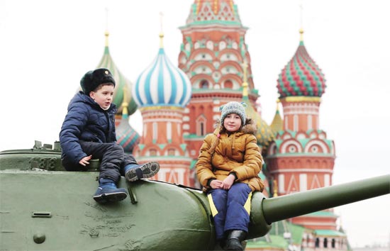 当地时间11月7日,莫斯科,为纪念1941年红场阅兵76周年,俄罗斯举行红场阅兵。当天,有儿童爬上坦克玩耍。