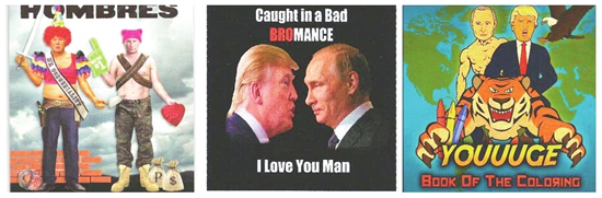 关于两人的恶搞越来越“辣眼睛”,俨然成为亚文化圈“明星”,甚至催生出一大批“周边产品”。针对这一现象,美国康考迪亚大学俄罗斯社会史教授艾莉森·罗丽正儿八经地做起了学术研究,并写成了严肃的研究报告《特朗普和普京一起坐在树上——2016年大选中的物质文化、同人及色情产物》。