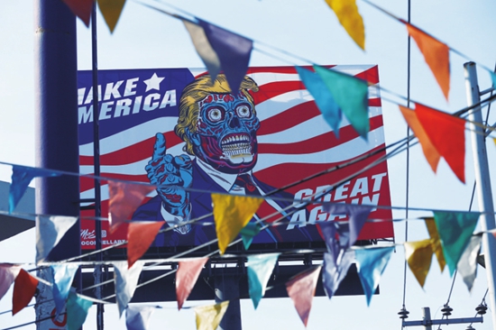 7月28日,墨西哥城一块广告牌以漫画讽刺美国总统特朗普。
