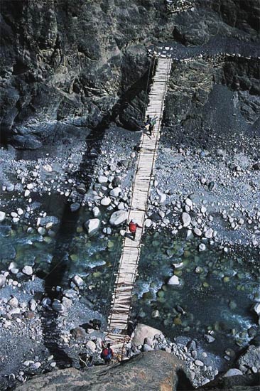 在离星峡尔学校35公里的地方,一座由木头、绳索和铁链制成的吊桥连接着河谷两岸,桥下是湍急的河水。吊桥一端的牌匾已经风化得斑驳不堪,只能勉强辨认出几个字:奇查·巴哥。