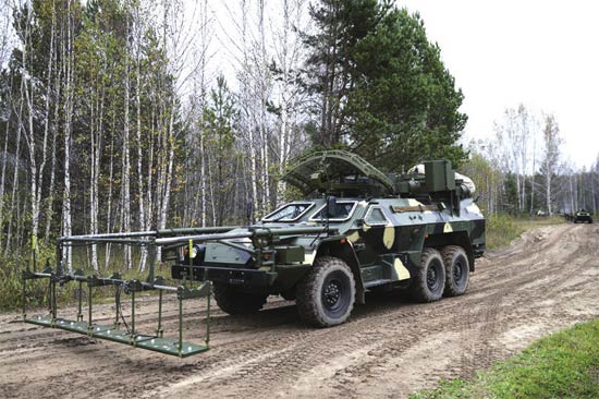 据乌克兰《防务博客》网站介绍,俄战略导弹部队将在2020年前接收超过20辆LISTVA扫雷车。LISTVA系统绰号“叶子”,专门用来为机动式导弹系统探测并排除爆炸物。该车基于6x6装甲车底盘,在引导车队行进期间会持续发射高频无线电波,使周边100米范围内的磁性地雷失效或提前爆炸,对遥控炸弹则利用电子战装置予以干扰;此外,车队进入高危区域前,LISTVA还能使用车体前部的探雷装置进行清理作业,并标记出安全通道。