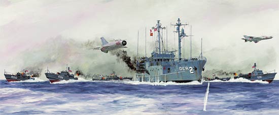 不久,朝鲜空军的飞机前来增援,一些士兵试图跳上美舰。“普韦布洛”号连连躲闪,朝方随即开始射击,一枚炮弹命中了美方的舰桥,船长劳伊德·布克等3人负伤。