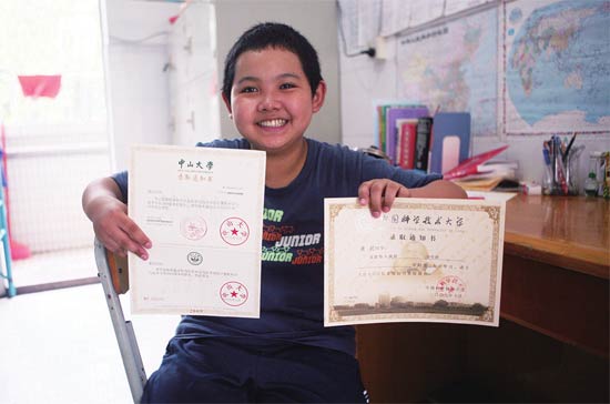 2009年8月3日,广东佛山,“小神童”龚民展示自己同时获得的中科大及中山大学录取通知书。