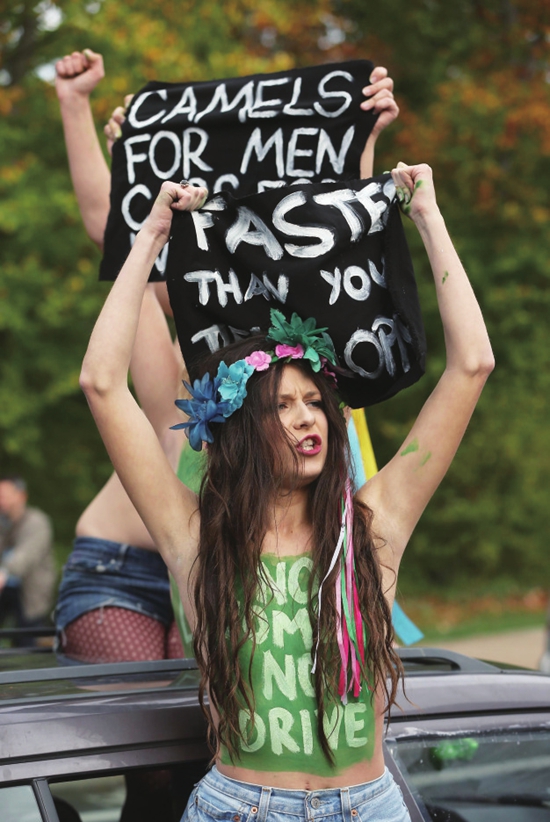 2013年10月28日,德国女权组织在柏林的沙特大使馆外示威,高举“开得比你都快”等标语,抗议该国禁止女性驾车的法律。在推出大刀阔斧的改革计划之前,沙特是全球最后一个禁止女性驾车的国家。图片来源 CFP