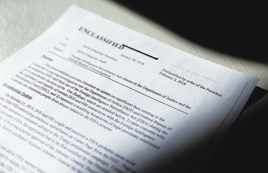 特朗普如此理直气壮,是因为一记重击箭在弦上。1月29日晚,国会众议院情报委员会投票赞成公布一份备忘录,给“通俄门”调查投下了重磅炸弹。这份备忘录由该委员会主席、来自加州的共和党人德文·努尼斯主持撰写,据美国《纽约时报》披露,仅仅4页长的这份文件曝光了FBI和司法部如何带着政治偏见进行非法窃听:根据《外国情报监视法》,FBI向法庭申请秘密监控许可,以便监听曾任特朗普阵营幕僚的卡特·佩奇。但他们依据的材料是英国间谍斯蒂尔伪造的,背后有希拉里的竞选团队和民主党全国委员会出资。FBI对此心知肚明,却隐瞒不报。
