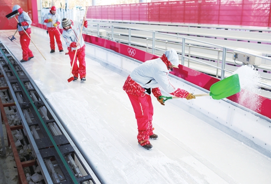 2月5日,工作人员在平昌为奥运场馆除雪。图片来源 CFP