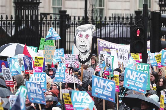 2月3日,民众在伦敦游行示威,要求首相特蕾莎·梅解决英国国家医疗服务体系的危机。图片来源CFP