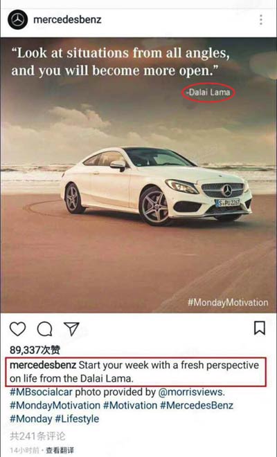 2月5日深夜,梅赛德斯-奔驰社交媒体账号发布的一张照片引发轩然大波。作为世界历史悠久和最大豪华汽车品牌制造商,奔驰允许达赖喇嘛的“名言”赫然出现在照片上方。更有甚者,这张图片还成了奔驰“新一周的开始”。