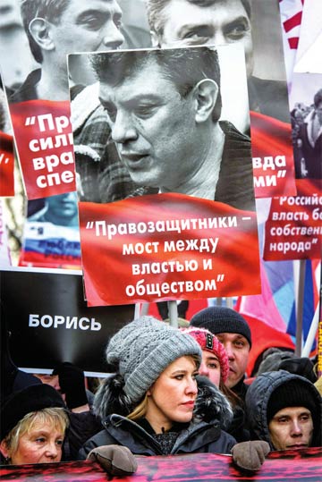 2月25日,莫斯科民众以游行纪念反对派政治家、前副总理涅姆佐夫遇刺3周年,总统候选人索布恰克(中)出席了游行。一些媒体称索布恰克是“普京的教女”,表现出反普京的态度是在“作秀”。
