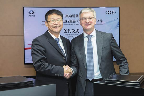 3月7日,在日内瓦车展上,一汽集团与大众汽车股份公司和奥迪股份公司签署了两份未来合资合作谅解备忘录。这两份备忘录分别为《成立一汽-奥迪销售公司的谅解备忘录》和《建立移动出行和更多的数字化业务相关服务新合资公司的谅解备忘录》。