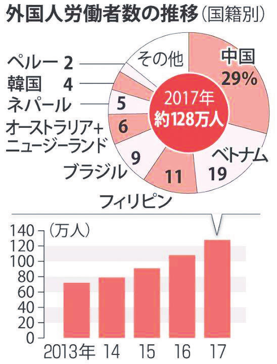 在日外国劳动人口变化数据(按国别分)2017年在日外籍劳动人口约为128万人,其中中国人占29%,越南19%,菲律宾11%,巴西9%,澳大利亚和新西兰6%,尼泊尔5%,韩国4%,秘鲁2%,其他约为15%。来源 日本《每日新闻》报网站