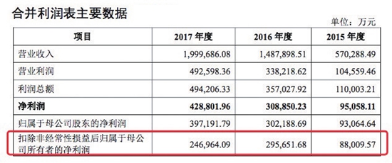 同时,2017年宁德时代营业收入为199.97亿,同比增长34.40%,与归属母公司股东净利润增速基本保持一致,但宁德时代2017年扣除非经常性损益后归属于母公司所有者的净利润为24.7亿元,同比反而下滑16.47%。