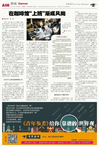 在线网络兼职平台FlexJobs和全球职场分析公司Global Workplace Analytics去年的一则调查也显示,2005年以来,至少有一半时间需要远程办公的人数增长了115%。如果加上个体经营者,以及越来越多的上班族,人数就更多了。他们中,虽然有的人仍然喜欢穿着睡衣在家办公,但还是有一大群人冲进了城市各个角落的咖啡馆。