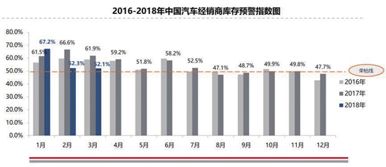 从“一线战况”来看,中国汽车市场一季度表现似乎令人担忧。2018年3月汽车经销商库存预警指数为52.1%,虽然环比下降0.2%,但库存预警指数已连续第三个月位于警戒线之上。