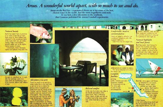 阳光普照的沙滩上矗立着小木屋,身穿潜水服的情侣笑容灿烂,水中鱼儿五彩斑斓,不远处是壮观的珊瑚礁,还有光怪陆离的沉船残骸;夜幕降临后,天空呈现出令人窒息的美景,数以百万计的星辰熠熠发光……“这就是红海之滨的阿鲁斯度假村,一个奇妙的新世界!”