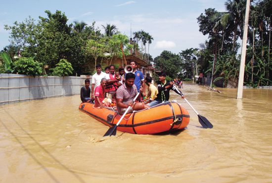 5月20日,特里普拉邦巴尔达哈尔村的村民们在暴雨后向安全地带转移。本版图片来源 CFP