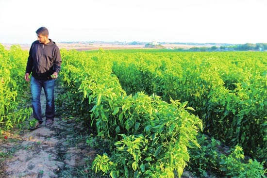 33岁的赫沙姆·扎卡里亚在加沙北部经营农场,主要种植辣椒。不远处就是以色列边境,不时能听到无人机轰鸣而过。过去,这片农场是柑橘园,但2008年战火烧毁了果树。从那以后,他们改种蔬菜和庄稼。