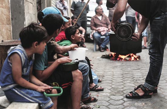 5月27日,加沙地带的穷人排队等待领汤。图片来源CFP