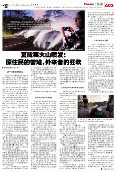 另一边,主管旅游的官员们则忙着公关,努力把世人的视线从刷屏的熔岩照片中移开。“夏威夷官员希望基拉韦厄火山喷发不会吓坏游客。”美国哥伦比亚广播公司(CBS)称,“即使地质学家警告说,火山很快会从山顶射出巨石。”