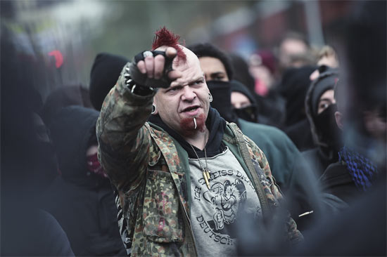 极右翼的影子不只在英国球迷中存在。2008年,德国足球流氓在欧洲杯上高喊新纳粹口号“所有波兰人都应该戴上黄色星星(指纳粹强迫犹太人佩戴的‘大卫之星’)”,惹来波兰球迷愤怒回击。2014年年中,反伊斯兰萨拉菲教派的示威者和足球流氓联手举行反难民游行,很快演变成右翼势力的大联欢,其代号“Pegida”是“欧洲爱国者反西方伊斯兰化”的缩写。这场排外游行很快席卷全德,一路延续至2015年年初。