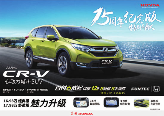 更令消费者惊喜的是,为纪念东风Honda成立15周年,CR-V特推出15周年纪念版——16.98万元经典版、17.98万元舒适版魅力升级,加装“9英寸智能导航”、“多视角倒车影像”、“高质感车顶饰条”等配置,配置提升的同时价格保持不变,诚意回馈市场。