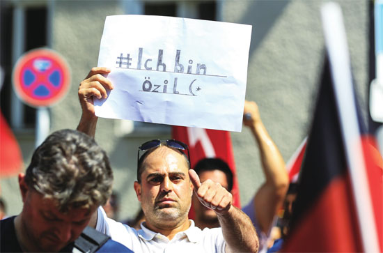 7月29日,球迷在德国柏林发起“我是厄齐尔”活动,挥舞土耳其国旗和德国国旗,呼吁提高对种族歧视的认识。