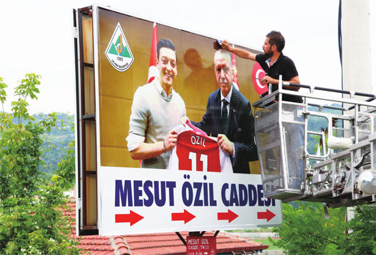 7月24日,厄齐尔的家乡土耳其代夫雷克竖起广告牌声援本地球员。正是这张厄齐尔(左)与土耳其总统埃尔多安的合影,导致厄齐尔被德国舆论“吊打”。