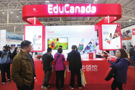 3月24日,北京2018中国国际教育巡回展上,家长和学生在加拿大留学展台前咨询。