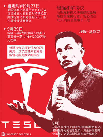 根据和解协议,马斯克和特斯拉将各自支付2000万美元罚款,马斯克将被禁止担任特斯拉董事长3年。翌日,特斯拉股价大涨超过17%,重回300美元。