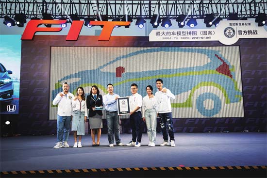 10月20日,“2018 FIT DAY飞度百万粉丝趣玩趴”暨飞度与粉丝吉尼斯世界纪录挑战盛典在广州举行,创造“最大车模型拼图”吉尼斯世界纪录。