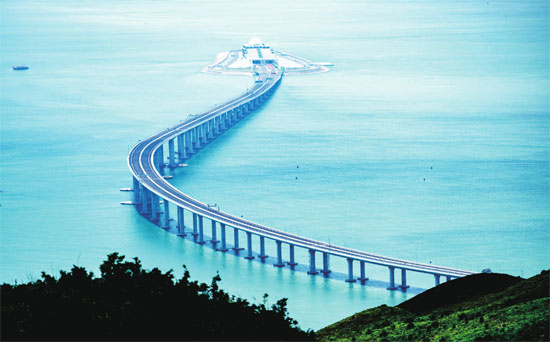 “中国用世界上最长的海桥延伸了想象力,”英国《卫报》如是报道港珠澳大桥的开通,“这座造价200亿美元的大桥是世界上最不寻常的道路之一。这条全长55公里的大型跨海通道连接了香港大屿山、澳门和广东省珠海市,是全球最长的沉管隧道及世界跨海距离最长的桥隧组合公路,单是主桥就长约29.6公里,海底隧道则长约6.7公里,并与四个人工岛连接。”