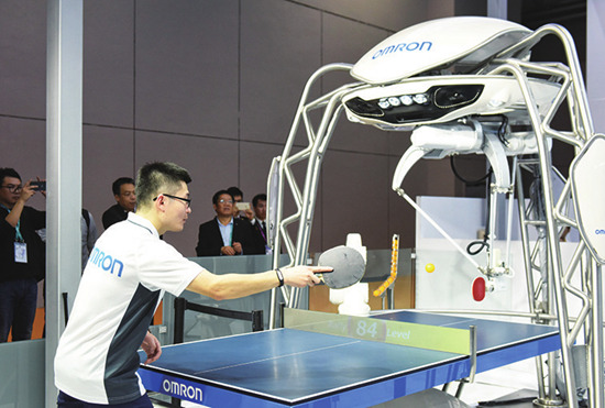 11月5日,中国首届进博会上,欧姆龙公司推出的乒乓球机器人在现场演示“人机对打”。图片来源 CFP