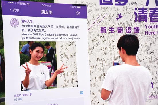 8月28日,清华大学2018级新生在校园内拍照留念。图片来源 视觉中国