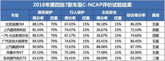 结果显示,比亚迪DM、广汽菲克大指挥官、上汽集团RX8、华晨中华V7分别以86.2%、86.4%、87.7%、83.9%的综合得分率获得五星评级;上汽通用昂科拉、一汽-大众新高尔夫分别以72.1%、74.6%的综合得分率获四星评级;东风柳汽风行T5则以63.2%的综合得分率获二星评级。