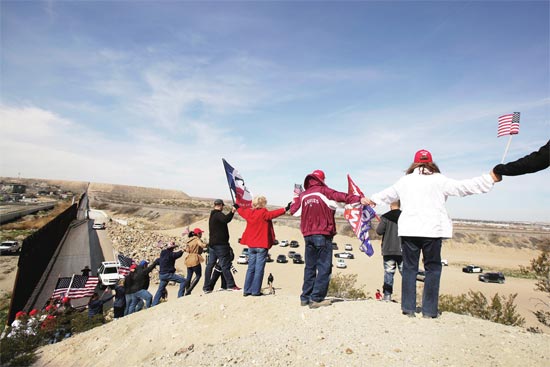 2月9日,特朗普的支持者在新墨西哥州桑兰公园的美墨交界处组成人墙,支持边境墙计划。图片来源 视觉中国