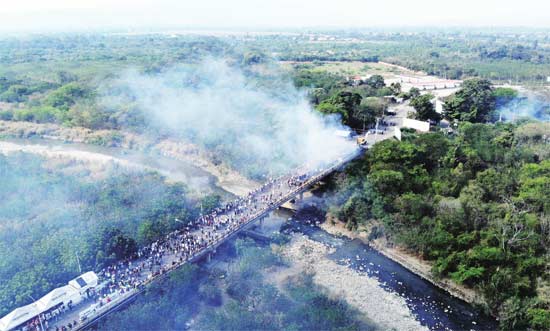 2月23日,委内瑞拉反对党领袖、议会主席瓜伊多自封“临时总统”满一个月。当天,他宣布开始将美国提供的“救援物资”强行运送入境。委内瑞拉边境多个地区随即爆发冲突,总统马杜罗下令关闭部分边境。24日,在一场政府支持者的集会上,马杜罗宣布与邻国哥伦比亚断绝外交和政治关系。