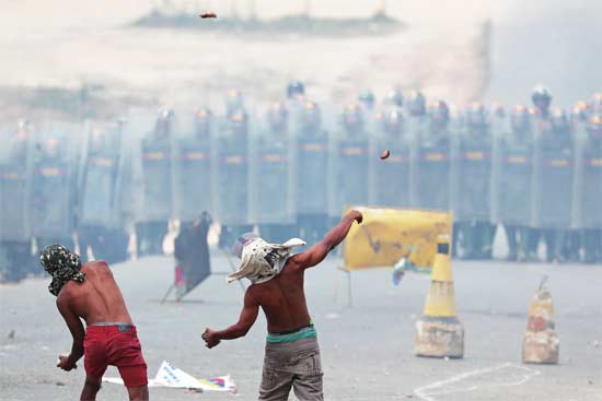 2月24日,在位于委内瑞拉与巴西边境的帕卡赖马,委内瑞拉国民警卫队组成人墙。