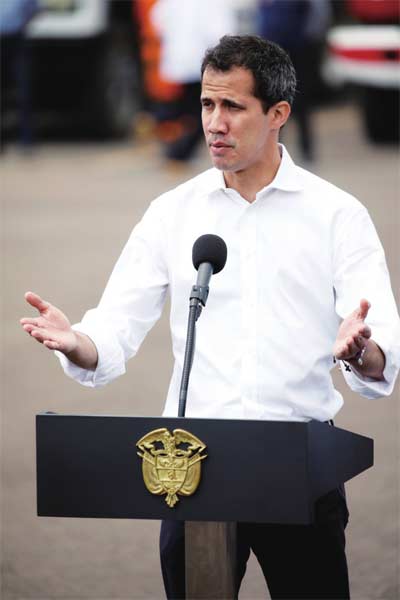 2月23日,瓜伊多在哥伦比亚库库塔市的“救援物资”存放点发表讲话。