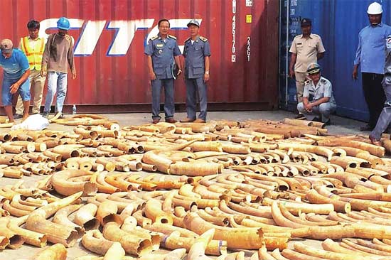 2018年12月13日,柬埔寨海关官员在来自莫桑比克的货船集装箱中发现了超过3.2吨象牙。图片来源 视觉中国