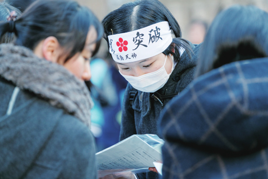2017年1月14日,东京的考生头上戴着祈求神明保佑考试通过的“钵卷”。图片来源 视觉中国