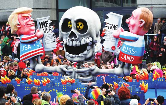 3月4日,德国杜塞尔多夫的“玫瑰星期一”狂欢节上出现了“美俄撕毁《中导条约》、放出核武恶魔”的场景。图片来源 视觉中国