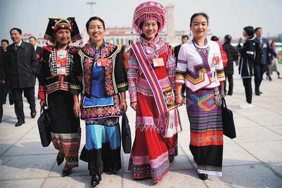 3月8日早上,几位少数民族代表准备参加十三届全国人大二次会议。图片来源 视觉中国